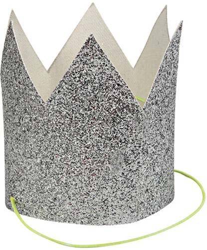 This 8 pack of silver sparkly party hat crowns by Meri Meri is super to make your guests feel like royalty! These glitter crowns will add a magical touch to your celebration, made from silver glitter fabric and finished with a neon yellow tie.