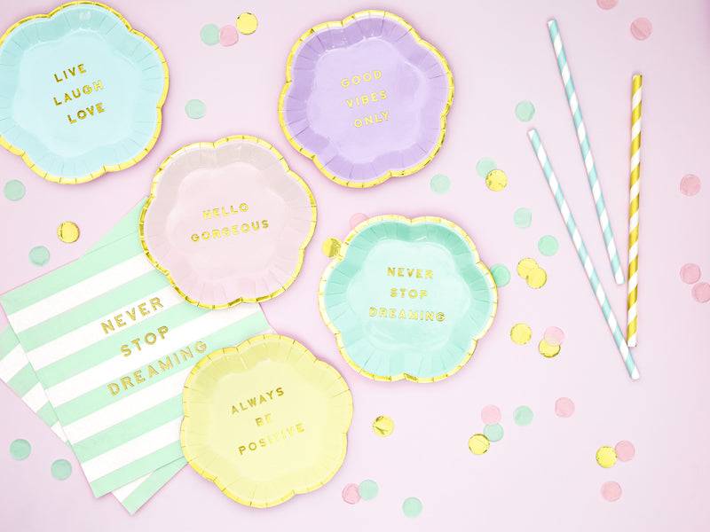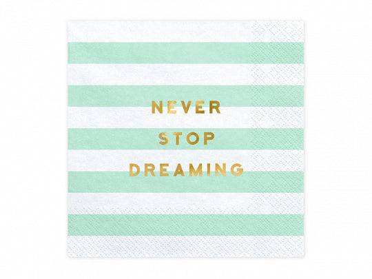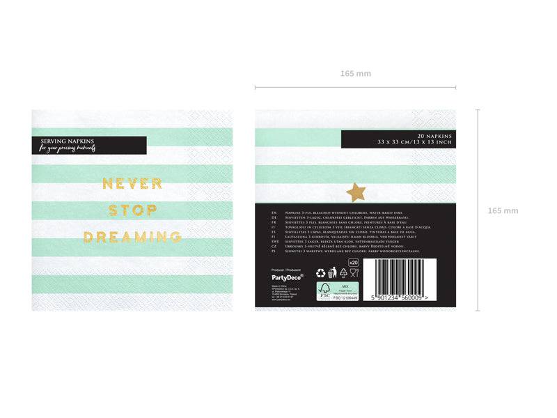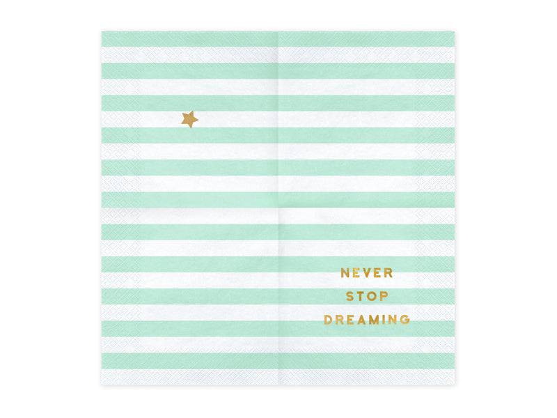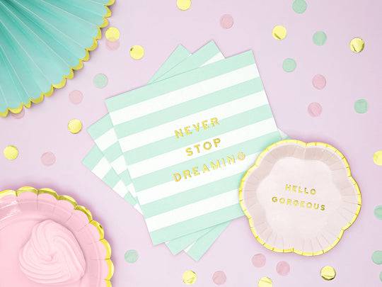 These light mint paper napkins are perfect for any bridal shower, baby shower, birthday, or any other celebration. They're designed with a fun and trendy never stop dreaming inscription that is sure to make your event memorable!