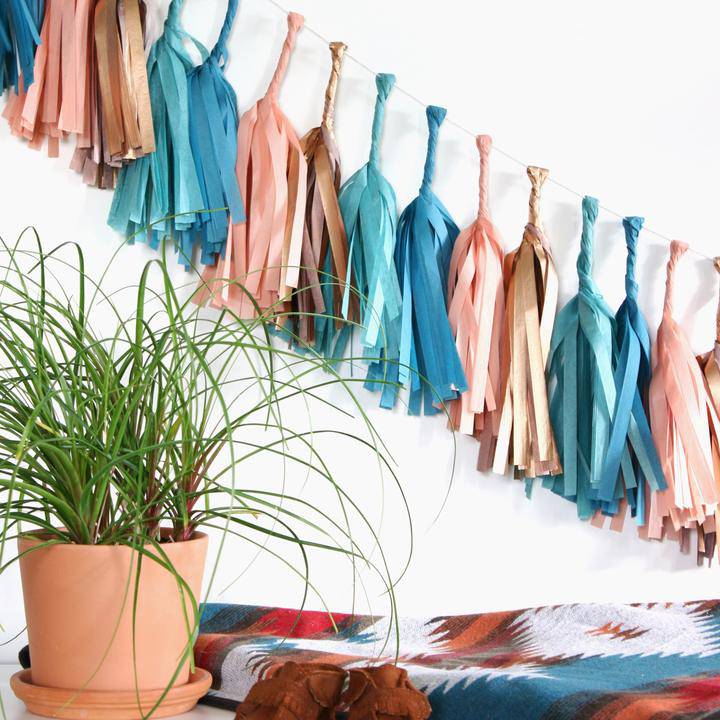 Makes 16 tassels and assembled garland spans approximately 6 feet. The tissue is pre-cut and twine for hanging is included. Instructions for assembly are pictured on the package insert. Made in the USA by The Flair Exchange Made with 100% recycled tissue paper.