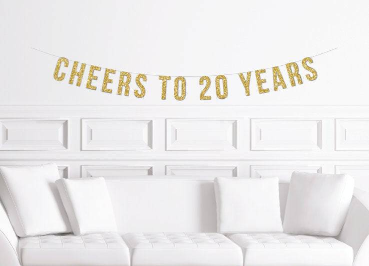 This listing is for one, paper, glitter banner of the popular birthday or anniversary phrase: CHEERS TO 20 YEARS