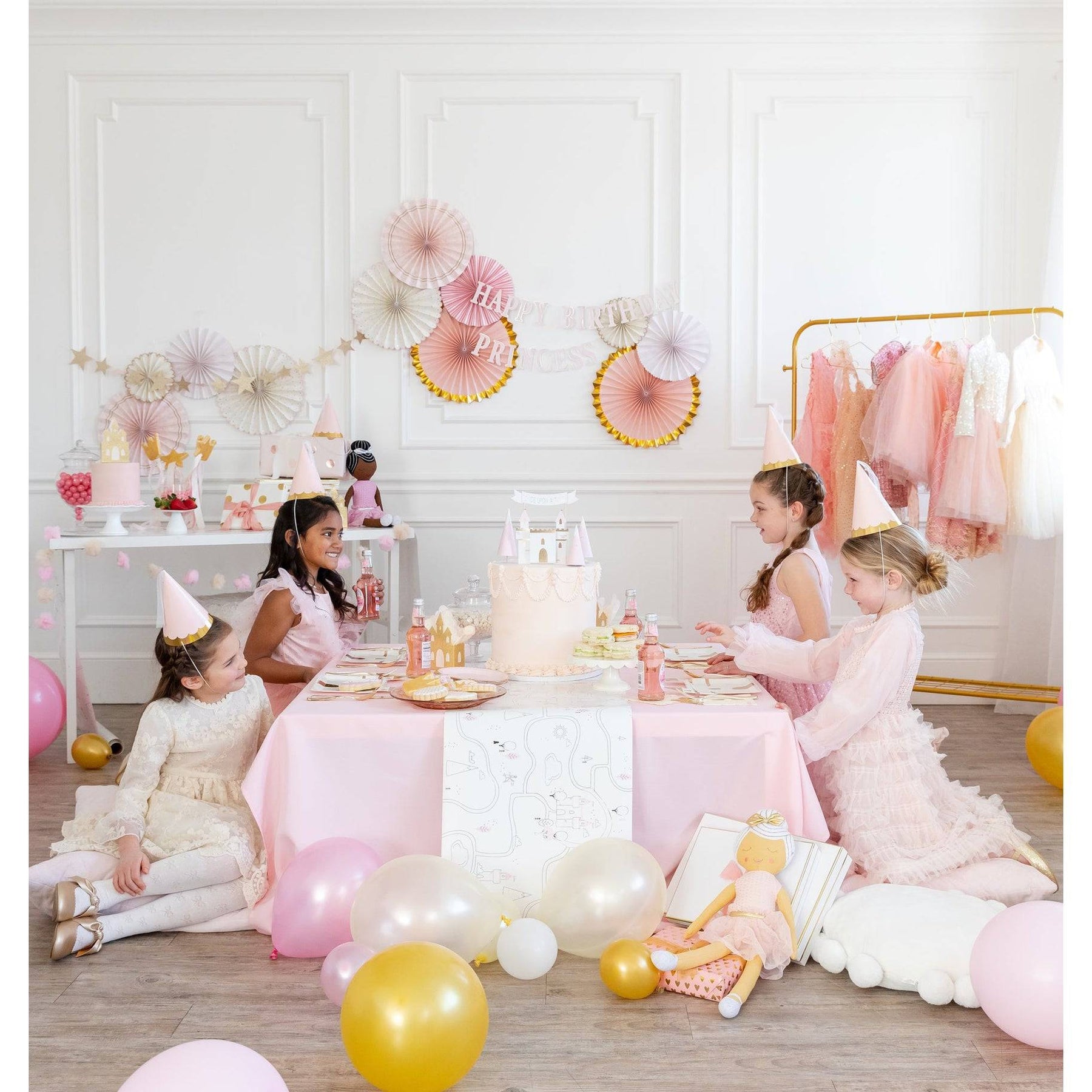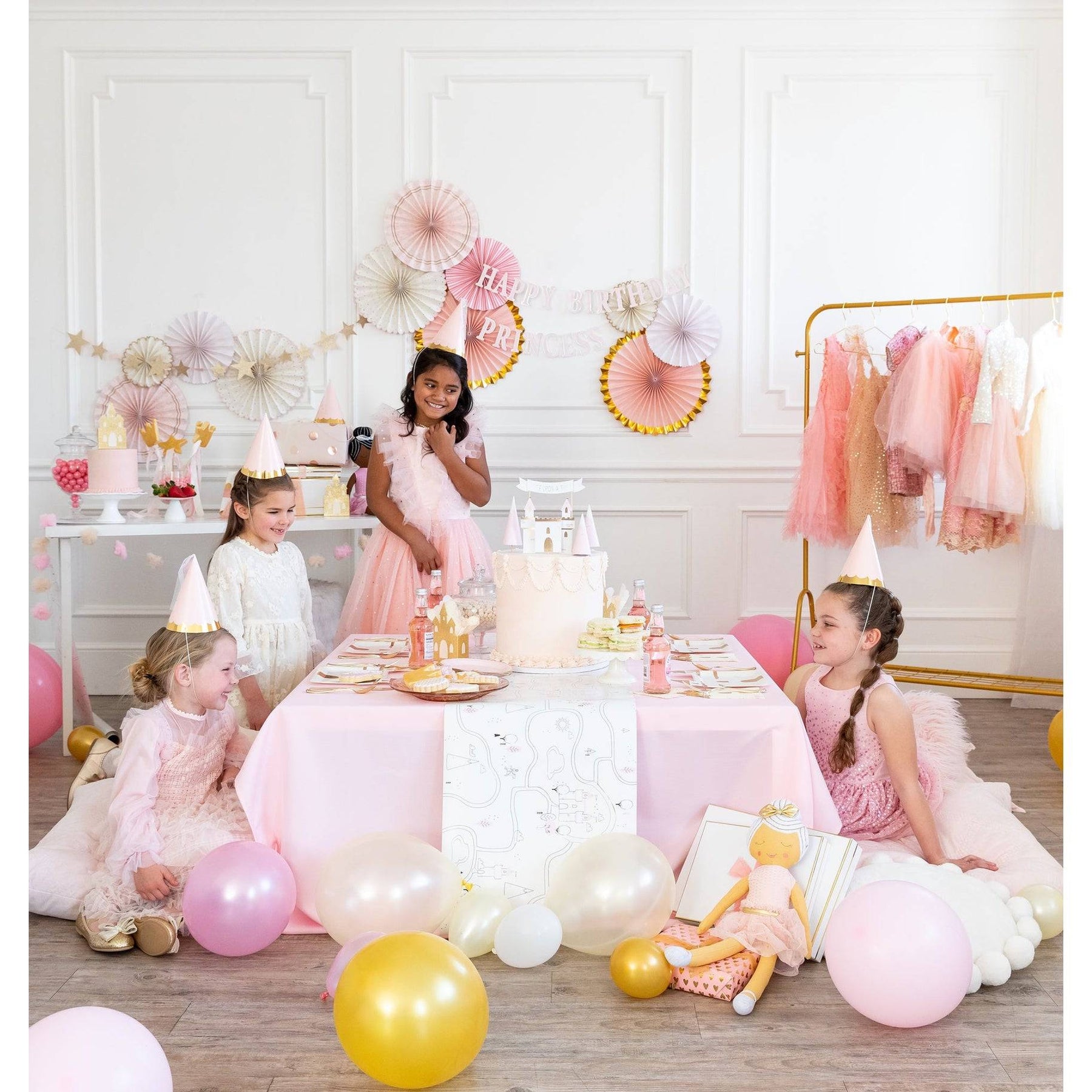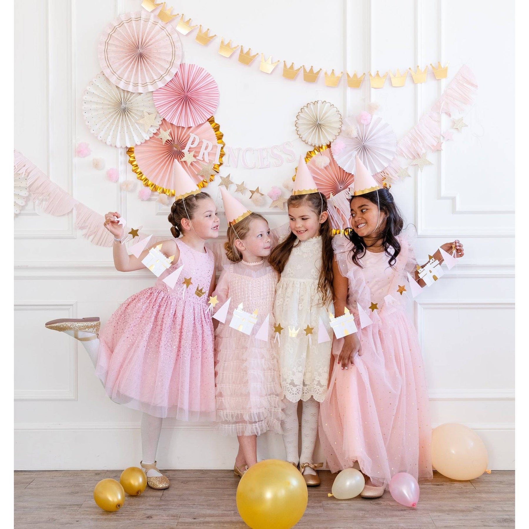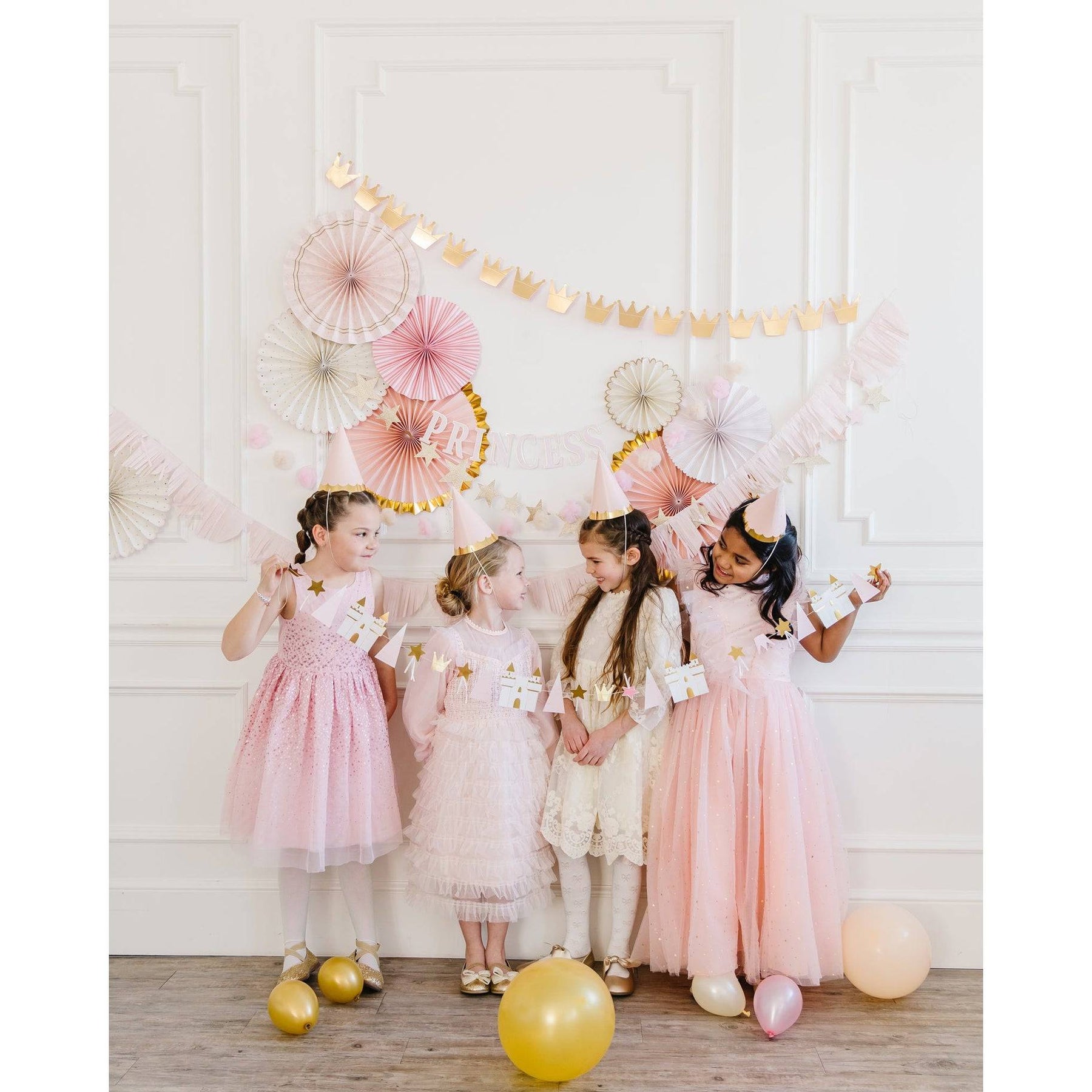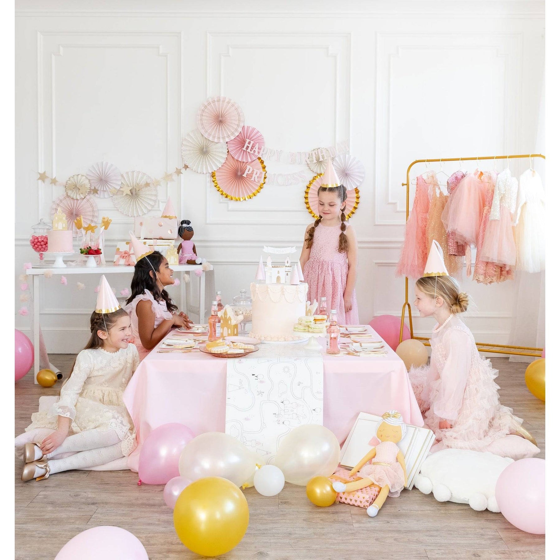 Create the perfect fairy tale day with our princess party fans! Designed with soft pinks and creams and gold foil accents these party fans will turn any space into a whimsical kingdom for your princess and her friends. This set party fans create a sweet party atmosphere for any birthday party, tea party or baby shower that calls for a soft color palette with a touch of gold shimmer.