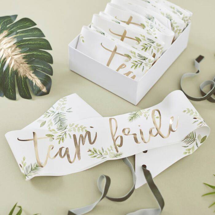 Sport these beautiful Team Bride gold and white botanical sashes on a night out to remember. The elegant colors are the perfect accent to compliment your bridal shower or bachelorette party!