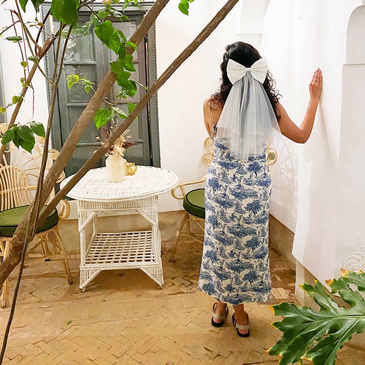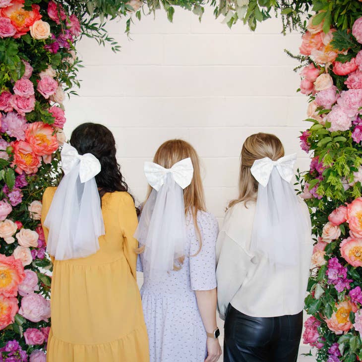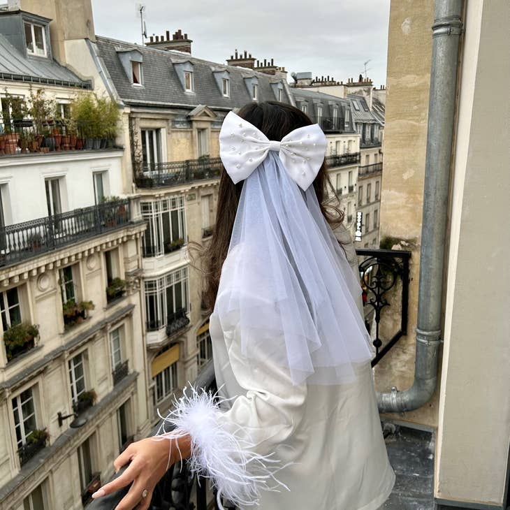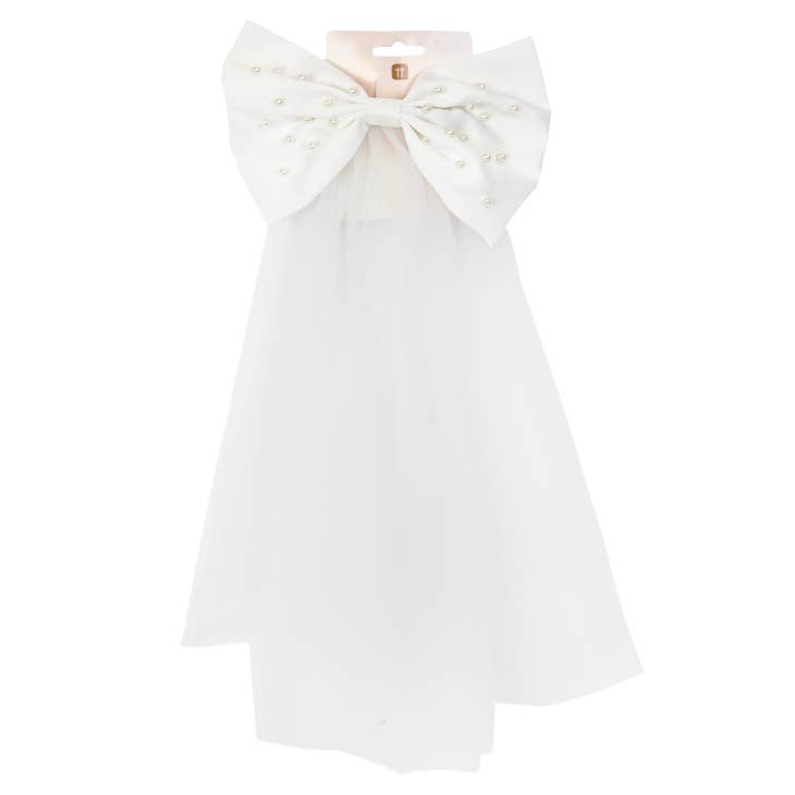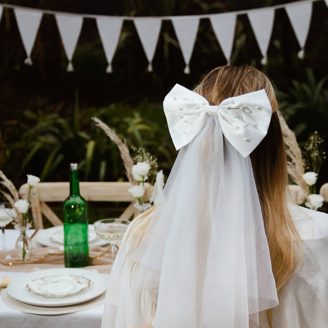 Make the bride feel extra bridal with this dreamy bow veil! Featuring an oversized white satin bow embellished with delicate pearls and a soft tulle veil, this headpiece is the perfect finishing touch for any bachelorette bash, bridal shower, or girls’ getaway. Whether you're hitting the clubs or brunching in style, this photo-ready veil guarantees all eyes on the bride-to-be!