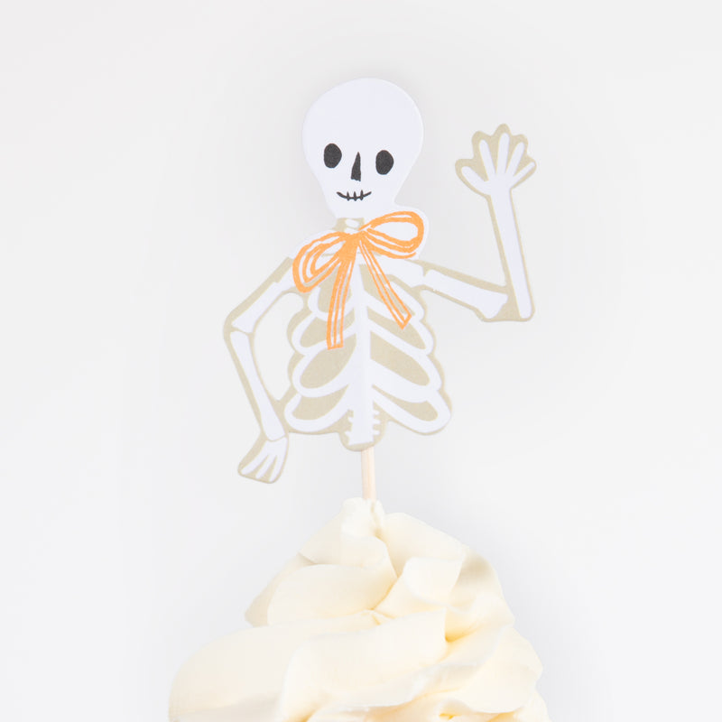 - 24 Toppers - 4 designs with six of each including a friendly witch, happy skeleton and pumpkin, and a ghoulish ghost