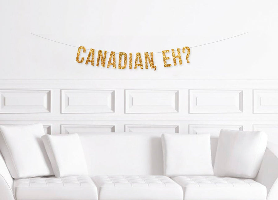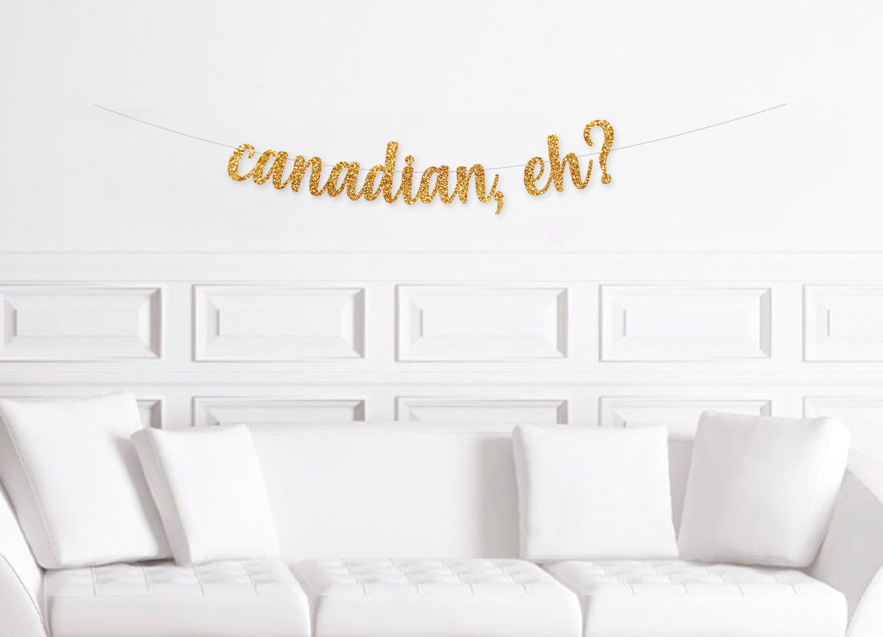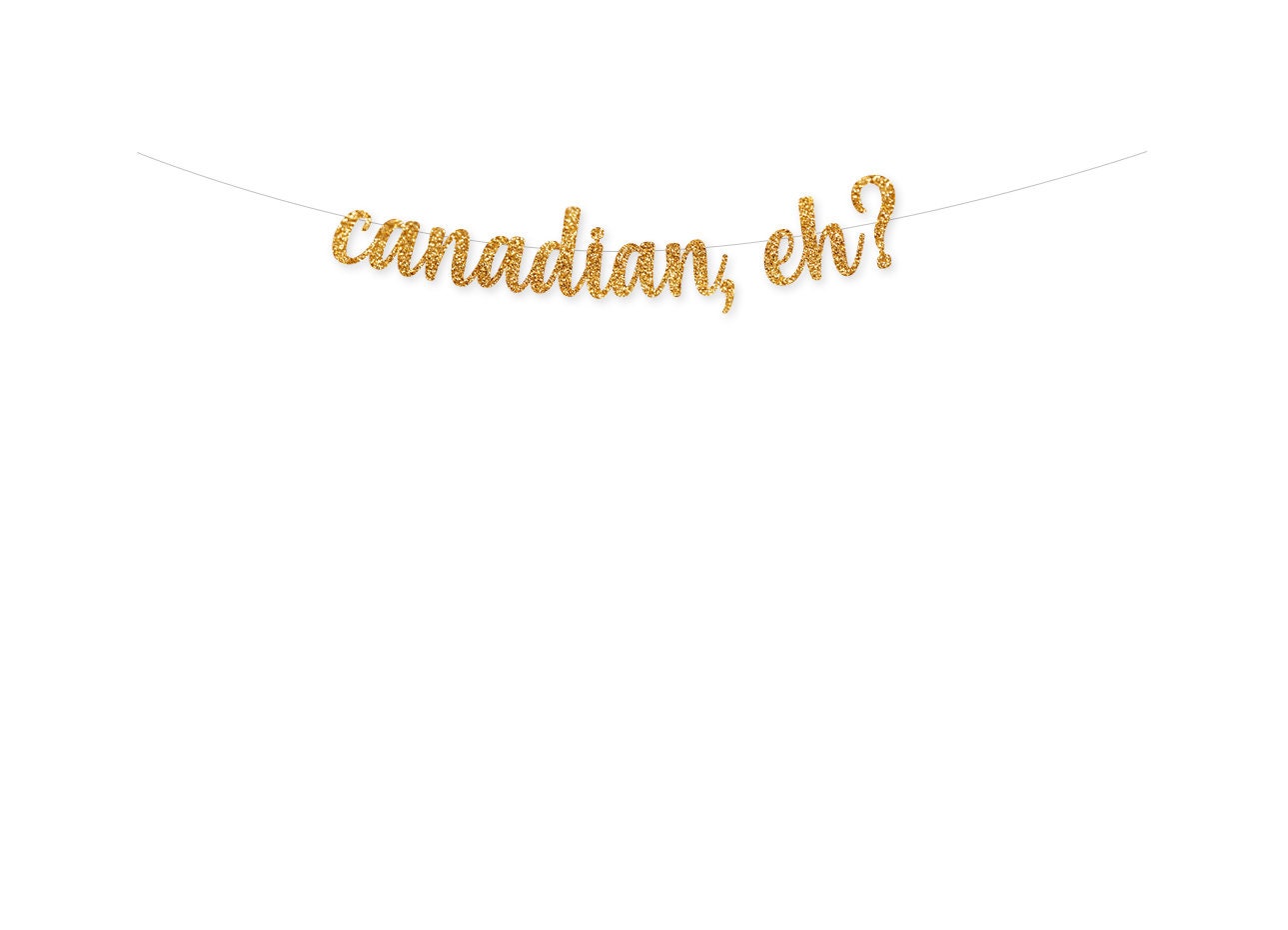 This listing is for one, paper, script font glitter banner of the popular Canada Day party phrase:CANADIAN, EH?Size: 5" tall lettersCanada Day Party Decorations, Canadian, Eh? Party Banner, Canada Day Party Decor Supplies, Red and White