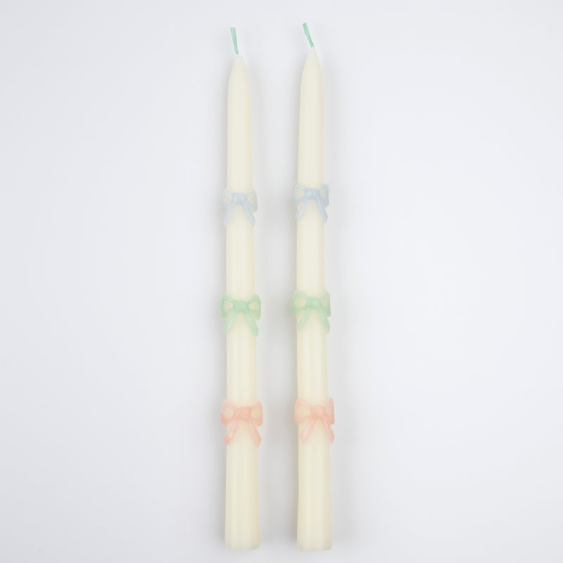These tapered candles, with on-trend bows, have a special surprise detail - mint green wicks! A wonderful hostess gift, or use to decorate the table or mantel at a party where soft pastel colours will look just perfect, like a baby or bridal shower.