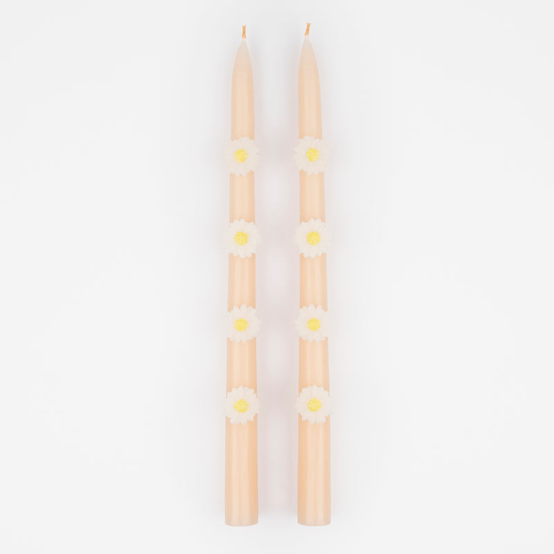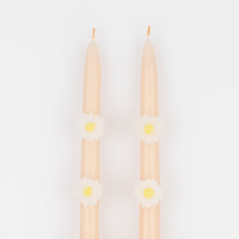 Why settle for plain candles when you can have delightful pink candles with charming daisy embellishments? These taper candles also feature pink wicks, and it's this attention to detail that makes them so special. They'll look lovely on your party table or mantel, making them ideal for a springtime party, fairy party, or princess party. They also make a great host gift.