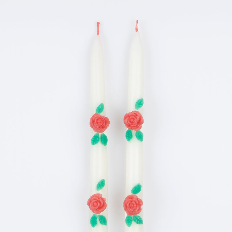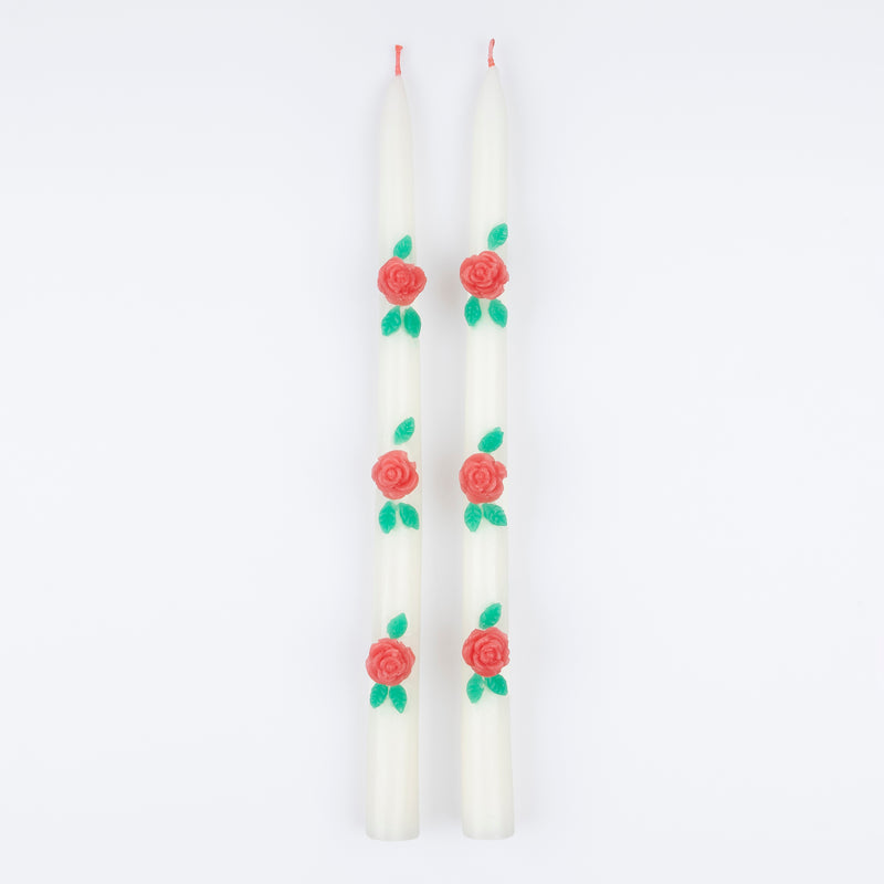 Soft candlelight is key for a romantic celebration. Why settle for plain candles when you can have these beautiful taper candles adorned with elegant red rose embellishments? Red roses symbolize love and devotion, making these candles perfect for your Valentine's table or mantel. Plus, the red wicks add an extra touch of charm – it's the little details that make them truly special!