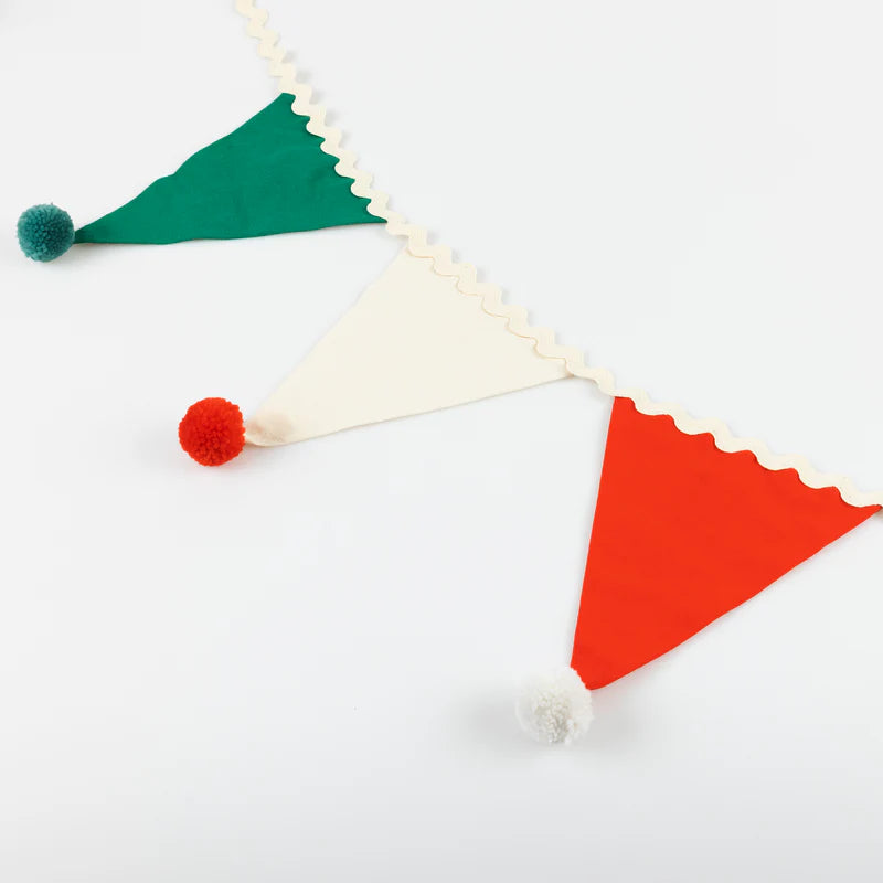 This pompom flag garland is the ultimate way to add a bold, festive touch to any space. Perfect to drape across a mantel; string along a staircase; or hang in a window, doorway or porch, for a joyful look. The mix of festive fabric flags with yarn pompoms, all in classic Christmas colors, adds texture and charm.