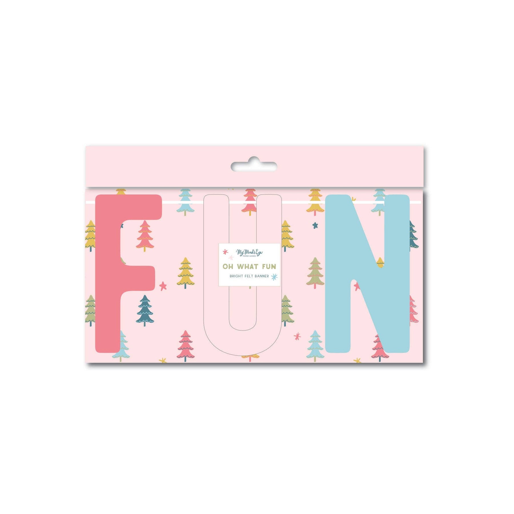 Oh what fun you will have making your loved one's spirits bright with this festive felt banner. Designed with a modern Christmas color palette, these word banner comes prestrung with the festive Christmas sentiment "Oh What Fun." This bright and modern holiday banner is sure to be piece of decor in your home all December long.