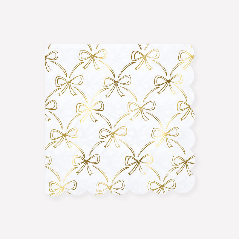 Elevate your celebration with these stylish paper napkins featuring shimmering gold bows and a charming scalloped edge. They add a touch of glam to any table setting, making every meal feel like a special occasion. These disposable napkins are as practical as they are pretty, perfect for family gatherings. Great for Christmas, New Year’s, golden anniversaries, bridal showers, and milestone birthdays.