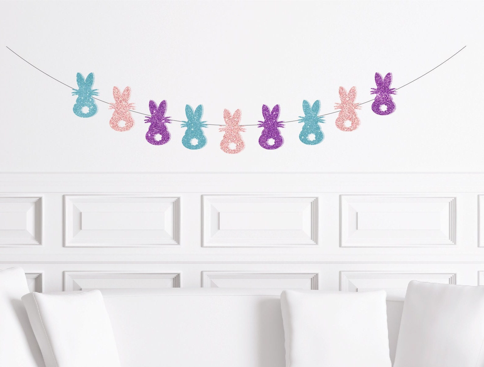 Easter Bunny Bunting, Easter Garland, Bunny Mantle Decoration, Pastel Kids Easter DecorThis listing is for one paper, glitter buntingSize: 5" tall bunnies x 9