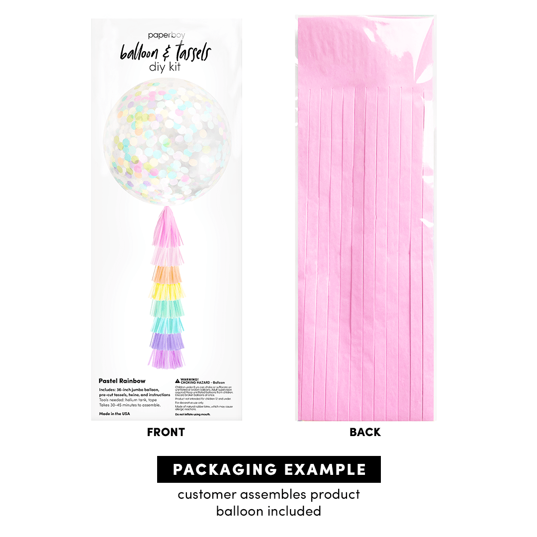 One of our most popular products! Tissue paper tassels cascade delicately from this giant balloon. It makes a huge impact at either a small gathering or large event. Requires about 45 minutes of assembly. We machine cut our tassels from premium grade tissue paper, for crisp edges and rich color.