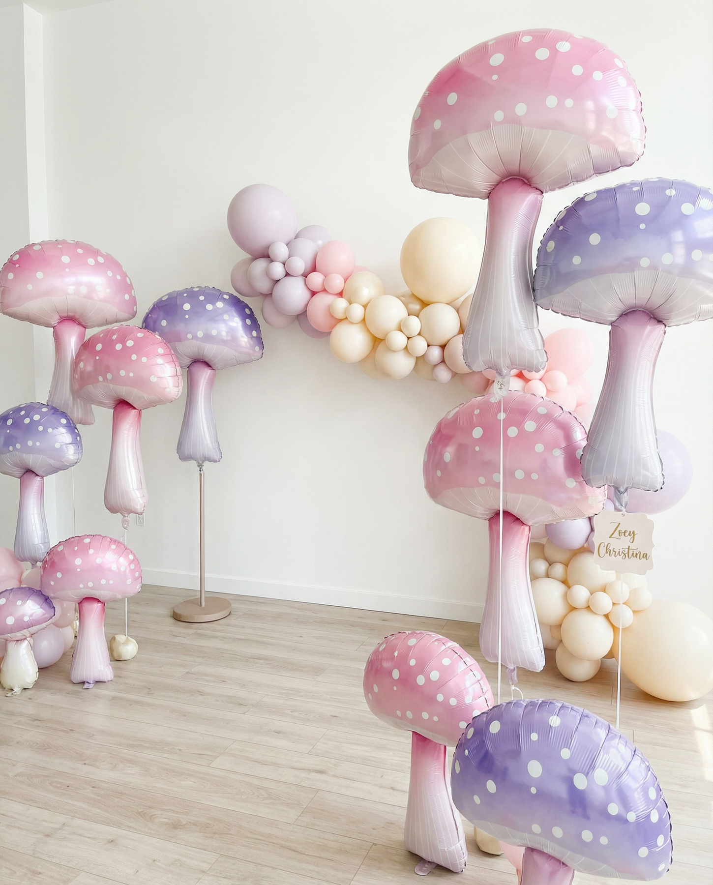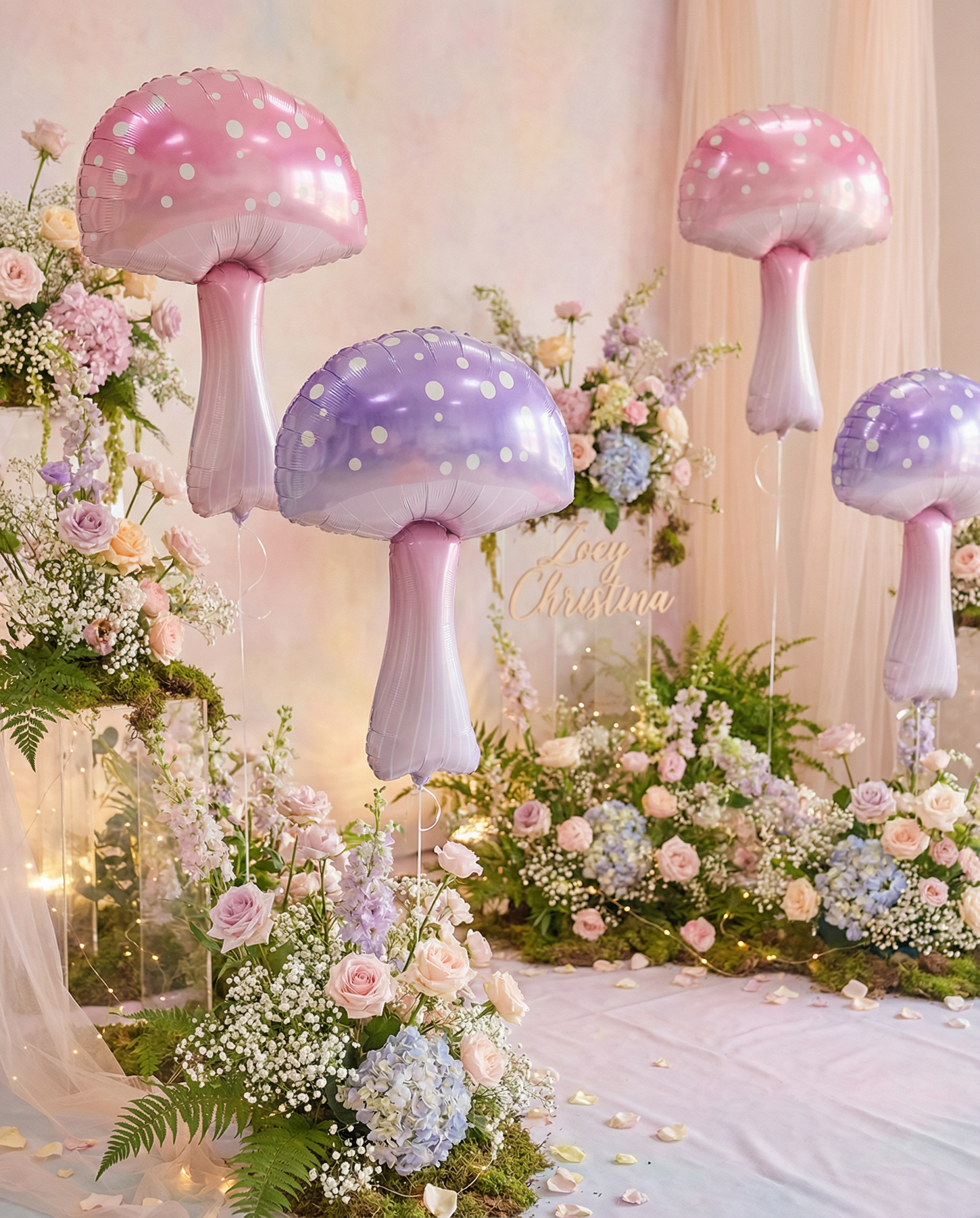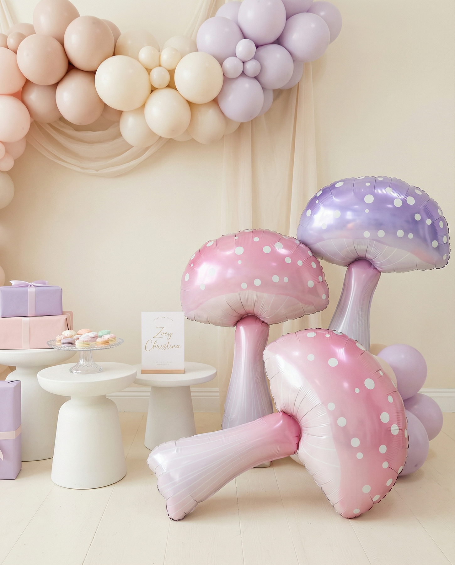 Transform your celebrations with these enchanting pastel mushroom foil balloons. Standing 36" tall by 23" wide, these oversized statement pieces feature delicate pink and lavender hues adorned with charming white polka dots. Perfect for event designers, florists, and party planners, they anchor displays, frame backdrops, and create magical focal points in fairy-tale themes, woodland scenes, and garden-inspired setups.