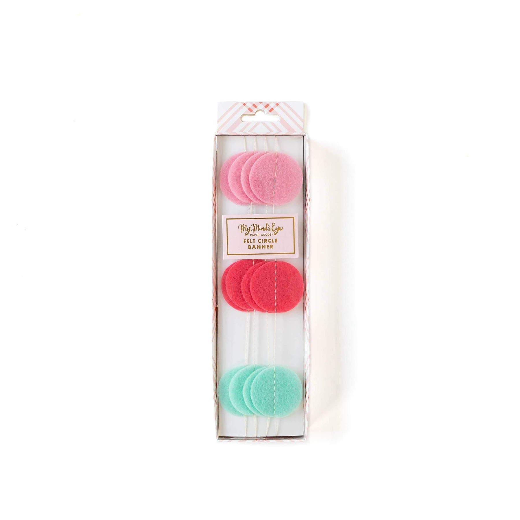 • Felt Banner is approximately 6' long • Sewn • Includes 24 - 2" felt circle in 3 colors: blue, dark pink, light pink