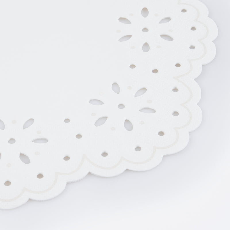 This pretty party range is inspired by broderie anglaise, a delicate lace eyelet embroidery design that's back in style. These large white napkins are ideal for table layering and for practical use too. They're perfect for bridal showers, baby showers or any celebration where you want a refined and elegant look.