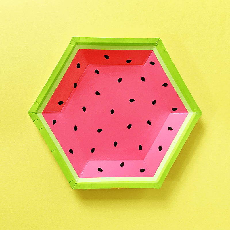 A totally cute and modern watermelon motif makes these paper plates perfect for any summer get-together! Each retail-ready pack includes 8 dinner plates. Each plate is 10.5 inches (27cm). Designed in Portland, Oregon USA. Want to see more