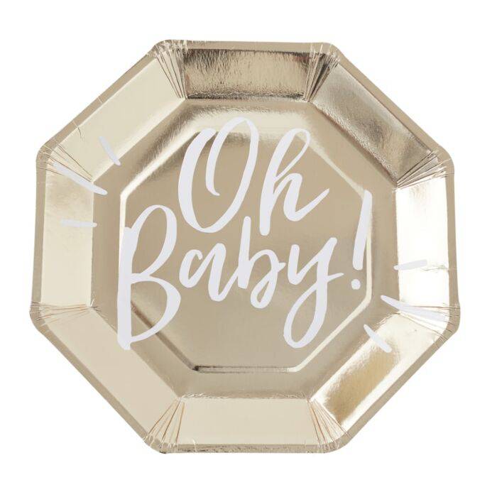 Celebrate with our gorgeous gold foiled 'Oh baby' gold paper plates. These adorable plates will make up the perfect setting for the glowing mummy to be and make eating tasty party treats easy!