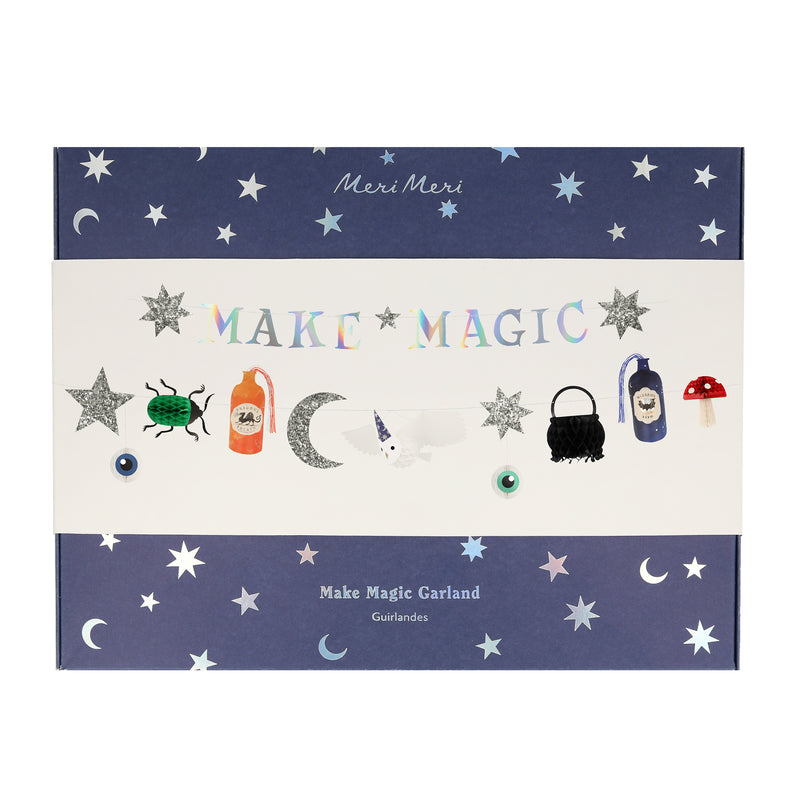 - The first garland features the words "Make Magic" with silver holographic foil, and stars covered with chunky silver glitter fabric