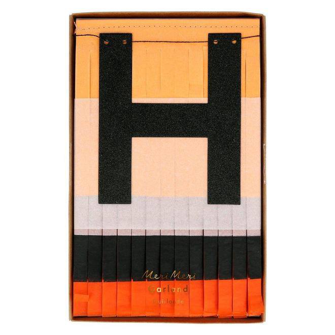 The banner's pennants are made with 2 layers each of peach, dusty pink, black and orange fringed tissue paper. The fringing is stitched together with satin ribbon at either end, and the letters are sprinkled with glitter.