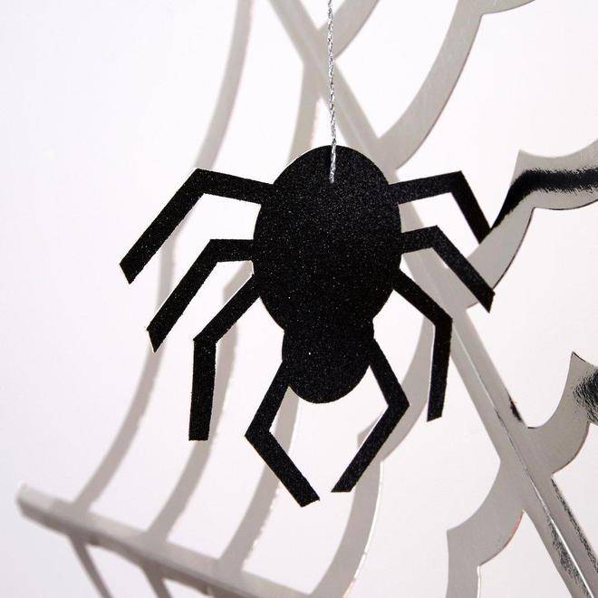 Features cobwebs which are crafted from card with shiny silver foil on one side and a printed color on the reverse. The spiders have black glittery bodies, and are pre-threaded with silver thread to attach them to the cobwebs.