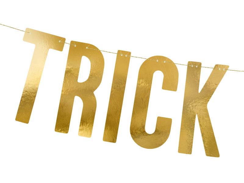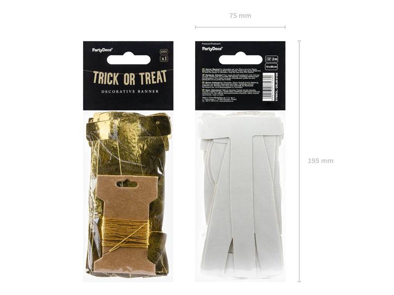 Banner Trick or Treat, mirror gold, do it yourself, set contains 12 letters and approx. 2 m of gold twine, sizes after assembling: height approx. 12 cm, length approx. 80 cm.
