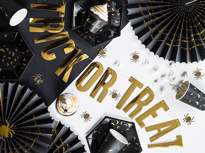 Use this fun decorative, gold Trick or Treat letter banner at a Halloween treat table or in a Halloween photo backdrop. The Halloween decoration possibilities are endless.