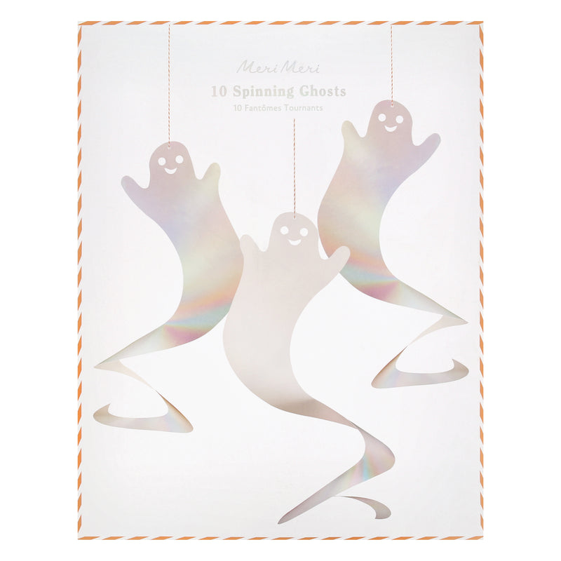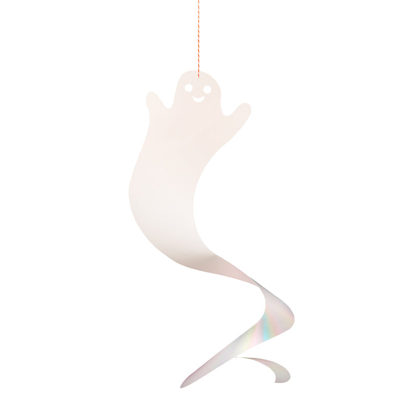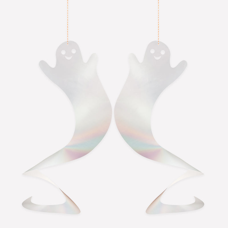 Twisting and floating, these happy paper ghost decorations bring the perfect mix of eerie and enchanting to your Halloween celebrations. Their two-toned design, with shiny silver holographic foil, catches the light for a shimmering spin that will mesmerize party guests and trick-or-treaters alike. Hang them from trees, porches, doorways or windows, anywhere a breeze can send them twirling. Plus, they're easy to store and reuse year after year.