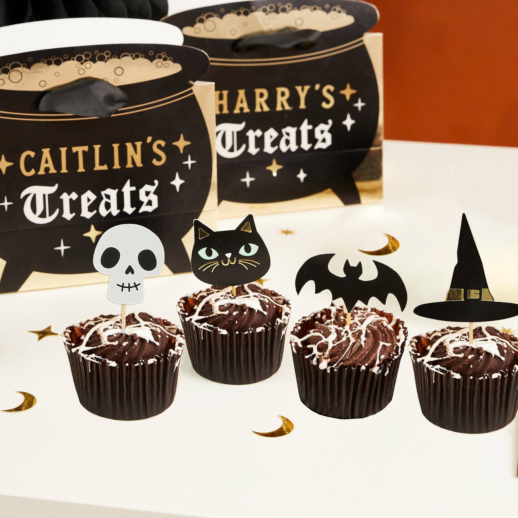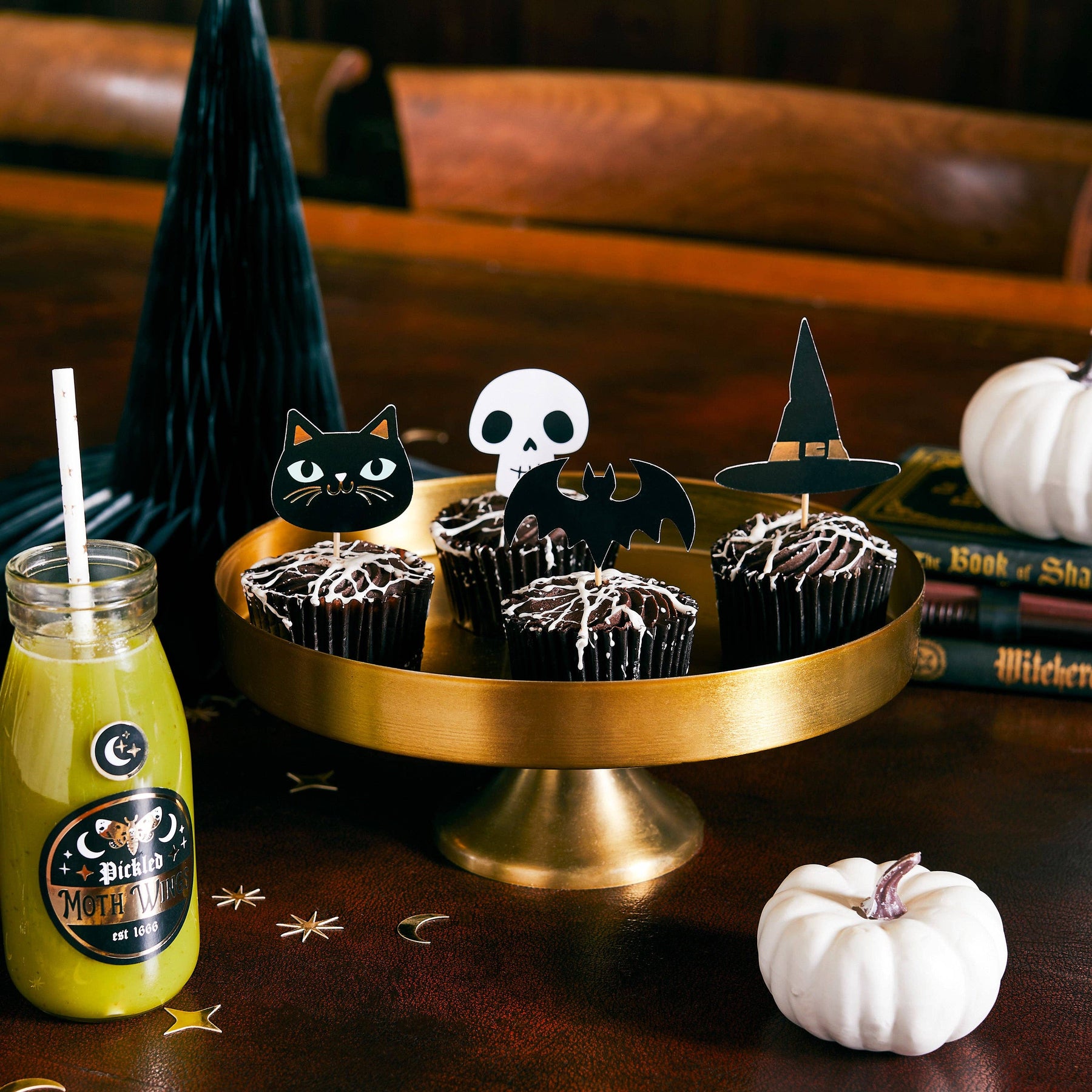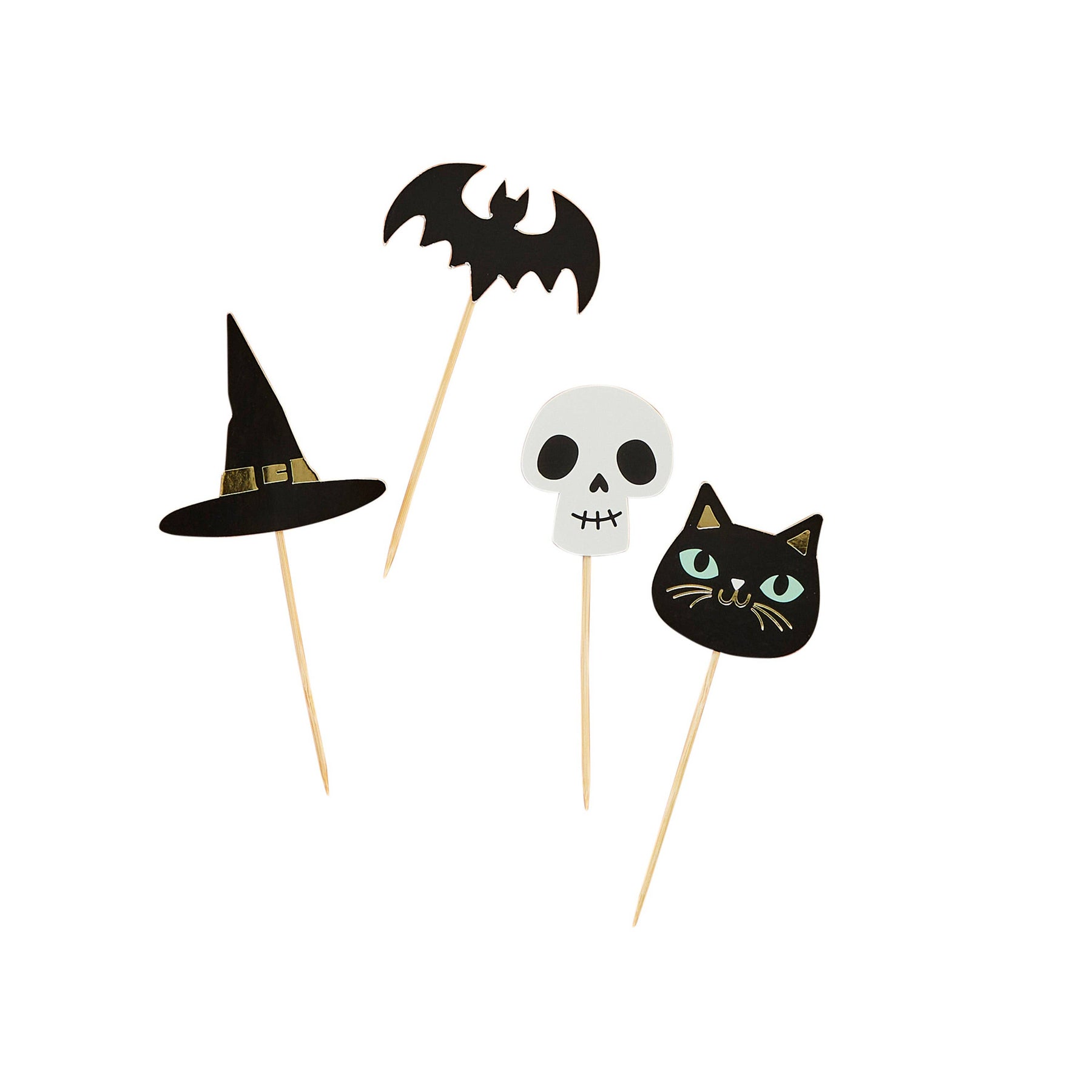 Add a spooky sparkle to your Halloween treats with our skull, cat, hat, and bat food picks! These golden accents will cast a magical spell on cakes, snacks, and beverages at your next haunted gathering.
