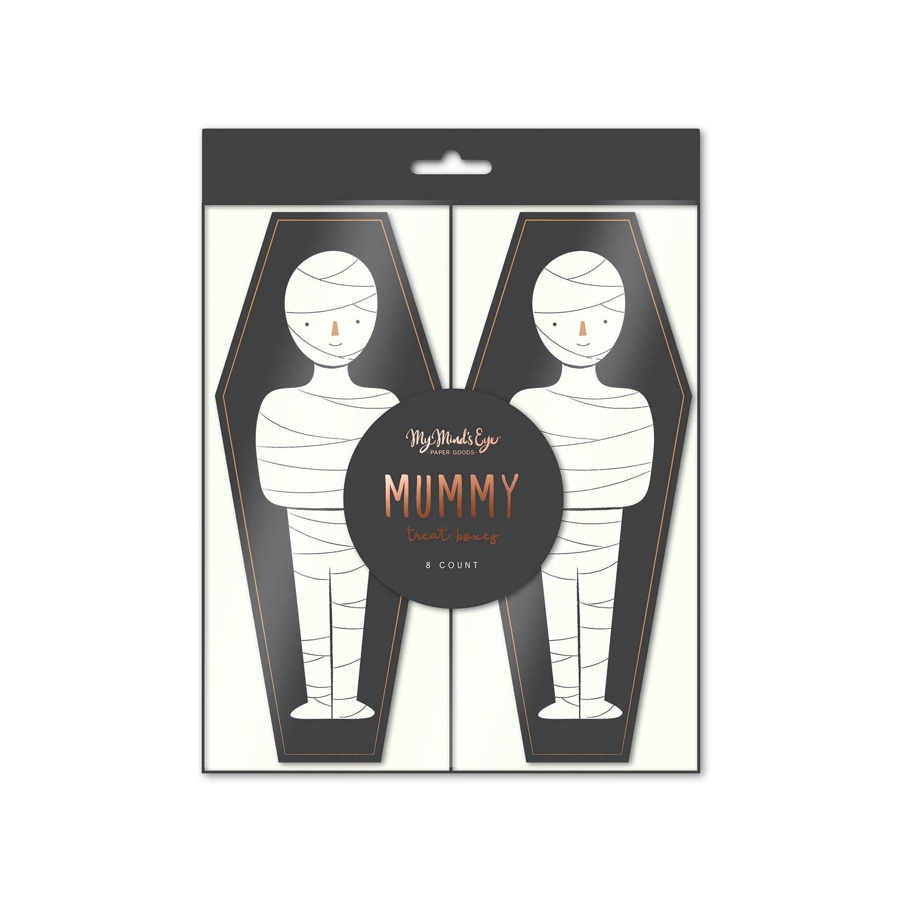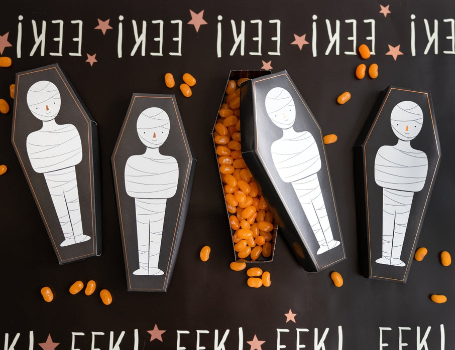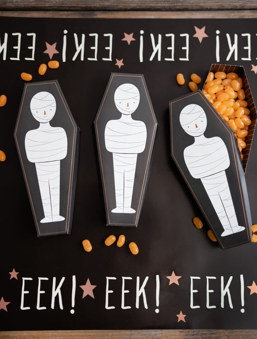 Elevate your mummy-inspired goodies this season by adding these spooky coffin treat boxes! These uniquely shaped containers resemble eerie coffins and showcase an adorable mummy design that will surely enchant trick or treaters of every generation.