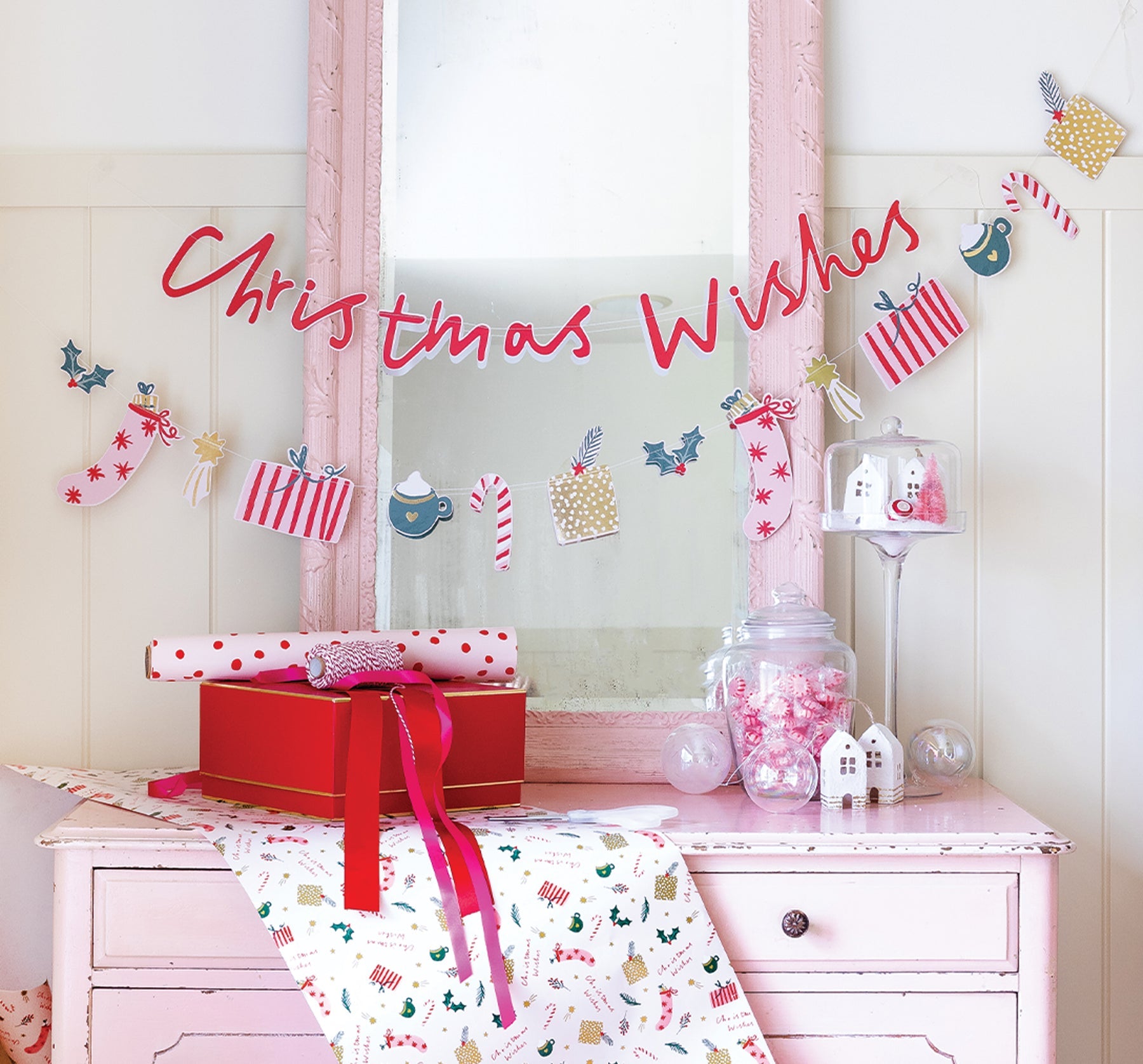 This holiday table runner is the perfect way to add some merriment to Christmas dinner with family or friends. Made with cozy Christmas icons like stockings, presents, cocoa, and holly, this table runner is the perfect way to create a whimsical Holiday table scape.