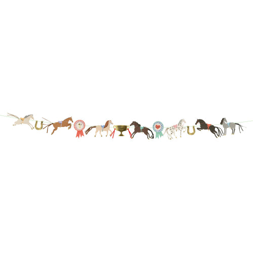 Add a touch of equestrian elegance with our horse garland. Featuring beautiful horses, shiny foil horseshoes, a champion cup, and colorful rosettes, this garland is perfect for parties or as a charming decoration in a horse-loving child's bedroom. Gallop into style and create a festive atmosphere with this gorgeous garland.