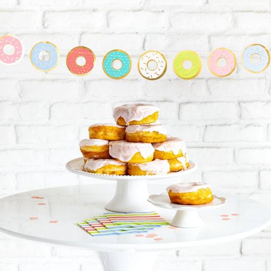 Do you love donuts? Then celebrate that love by hanging this cute donut banner to show it. Perfect for a donut themed birthday party or bakery display. Celebrate the baker's dozen you picked up for the Monday meeting. However you choose to celebrate with donuts, this colorful banner makes a delicious display!