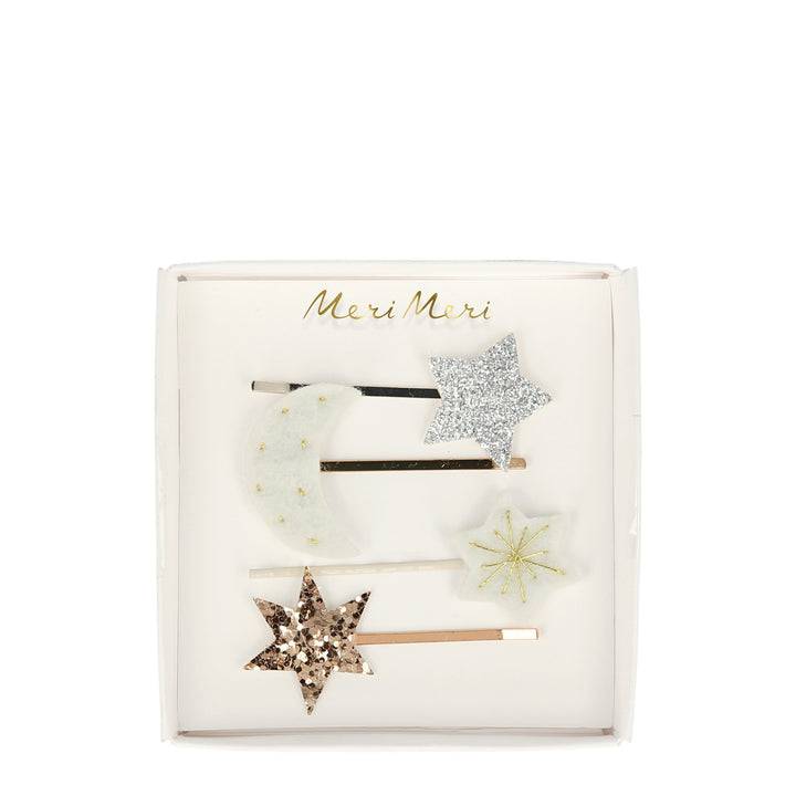 Add a little extra embellishment to your hair with these gorgeous moon and star hair slides. Beautifully crafted from felt and glitter fabric with shimmering gold details.