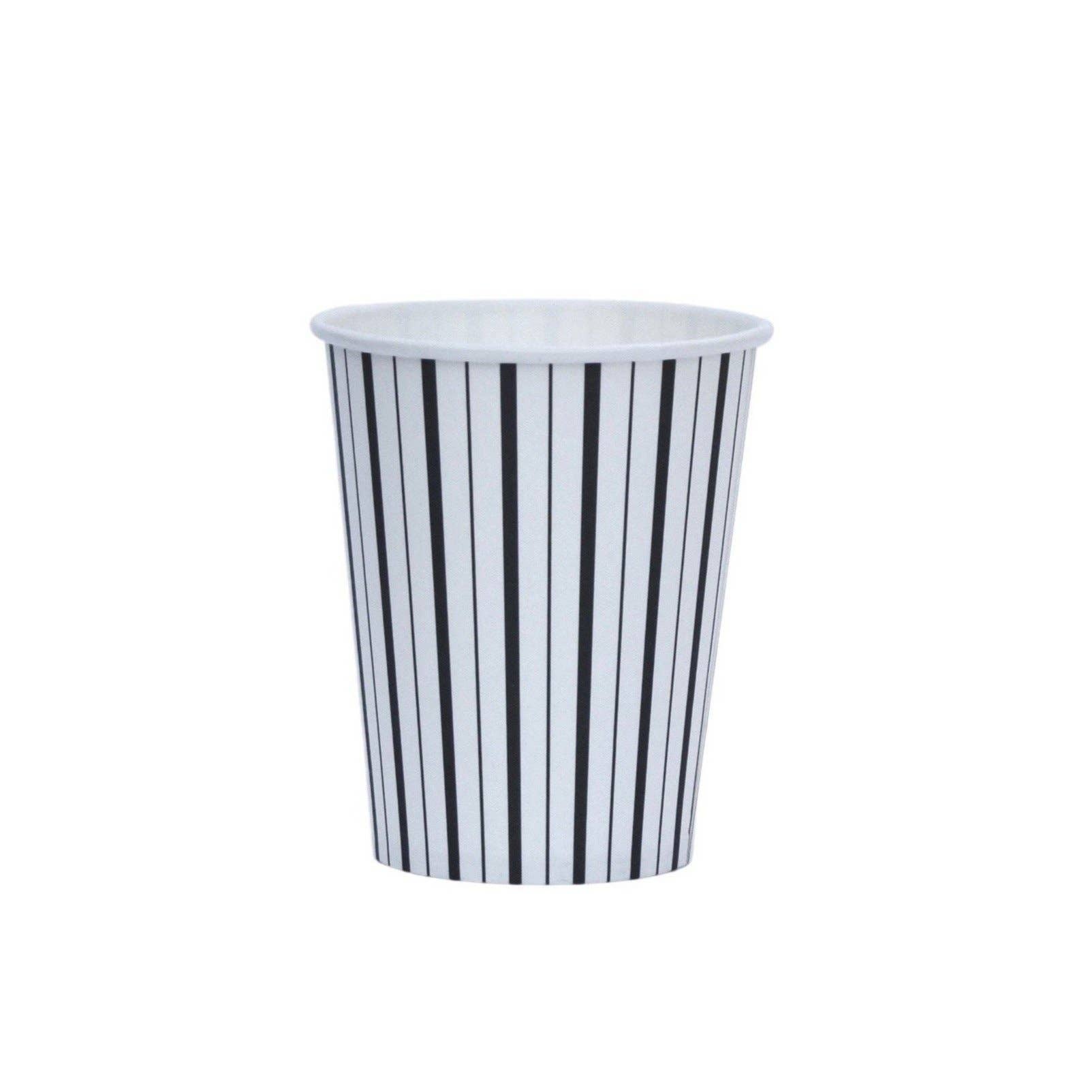 Black and white fine stripes paper cups are delicate and classic. Great mix-and-match for themes as galaxias, superheroes, happy colors or Steam train! Check out the full line of black stripes, including large plates and square napkins. Designed by Pooka Party