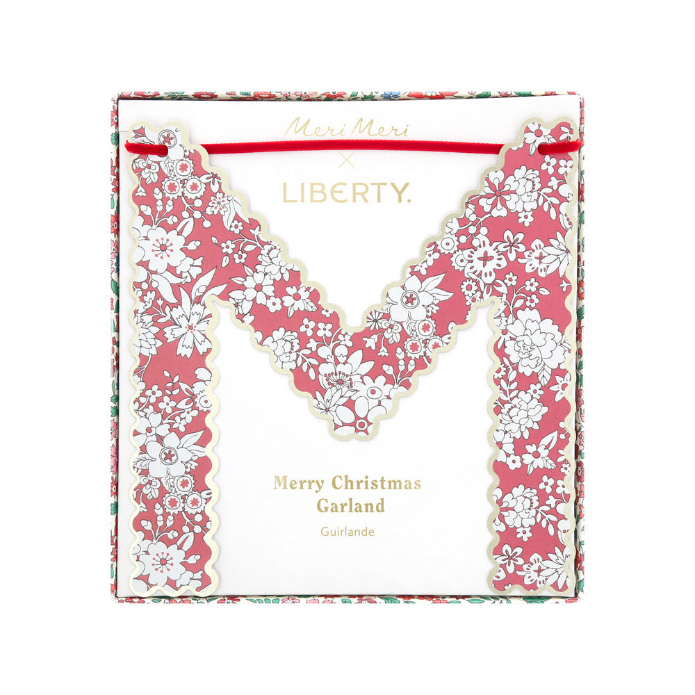 They've collaborated with Liberty to bring a touch of elegance and merriness to your Christmas decor. This stylish paper garland, featuring Liberty floral prints in joyful festive hues, with pale matte gold edged scalloped letters and red velvet ribbons, blends charm with sophistication. Perfect for your porch, doorway, wall, mantel, window, or on your party table.