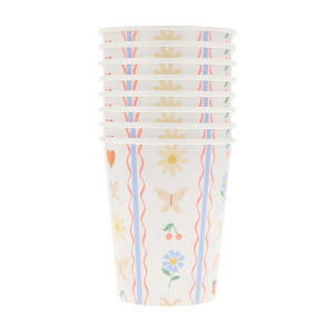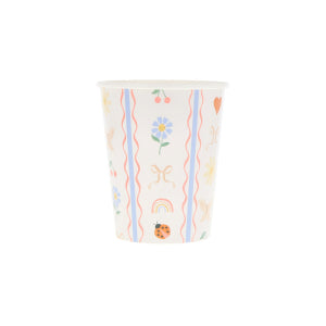Blooming with playful detail, these Little Garden paper cups will turn every drink into a celebration. The pretty textile-inspired pattern of ladybugs, hearts, bows, flowers and rainbows enchant in soft pink, red and blue tones. Perfectly sized for sophisticated sipping, each cup holds 9oz and is suitable for both hot and cold drinks.