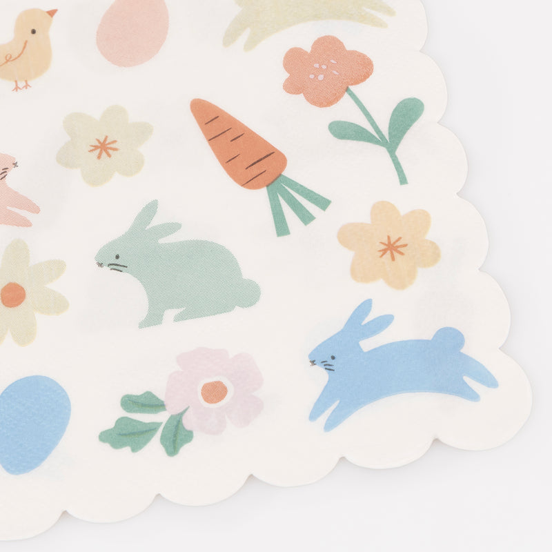 Elevate your Easter with these elegantly scalloped paper napkins. Each one features charming illustrations of bunnies, carrots, flowers, a chick and eggs, bringing a playful, decorative touch to your celebration. Perfect for adding a little springtime joy, and style to your table layering, they're guaranteed to delight guests of all ages. Made from premium 3-ply paper, they're also ideal to handle sticky fingers and faces, or spills, with ease.