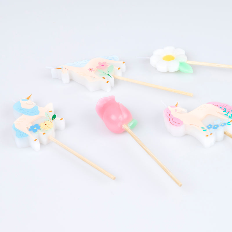 The perfect pairing of unicorns and meadow flowers creates a party paradise. These lovely candles will transform any unicorn or princess party cake into a magical centerpiece.