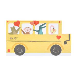 All aboard for Valentine’s fun! This school bus-shaped box is filled with adorable stand-up animal cards, ready to share some love. The set includes a cheeky crocodile, lion, monkey and bear, each holding a pink or red heart with a playful little message. Each card comes with a colorful friendship bracelet, in pink or blue, ready to tuck into a co-ordinating bus-shaped envelope. Suitable for ages 3+.