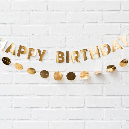 What says Happy Birthday better than this adorable gold Happy Birthday banner? Pair this with our Gold Foil Mini Pennant Banner for a layered look.