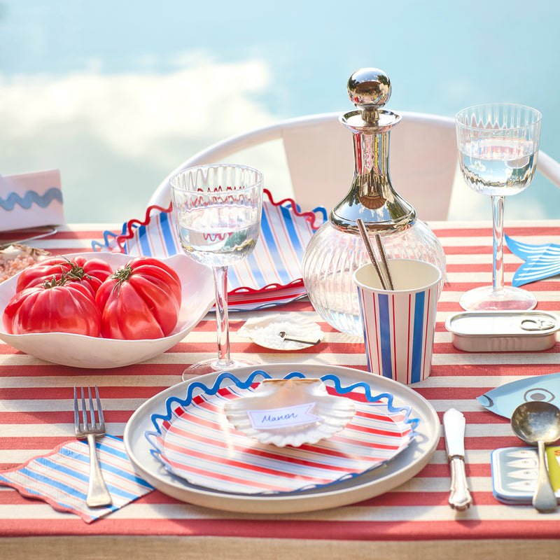 Dive into seaside elegance with these charming small paper napkins. Adorned with crisp red, white, and blue stripes and a playful scalloped edge, they bring authentic nautical flair to your table. Ideal for summer celebrations, beach-themed events, children's parties, and patriotic gatherings, these napkins combine coastal charm with timeless style. Transform any occasion into a breezy, sophisticated affair.