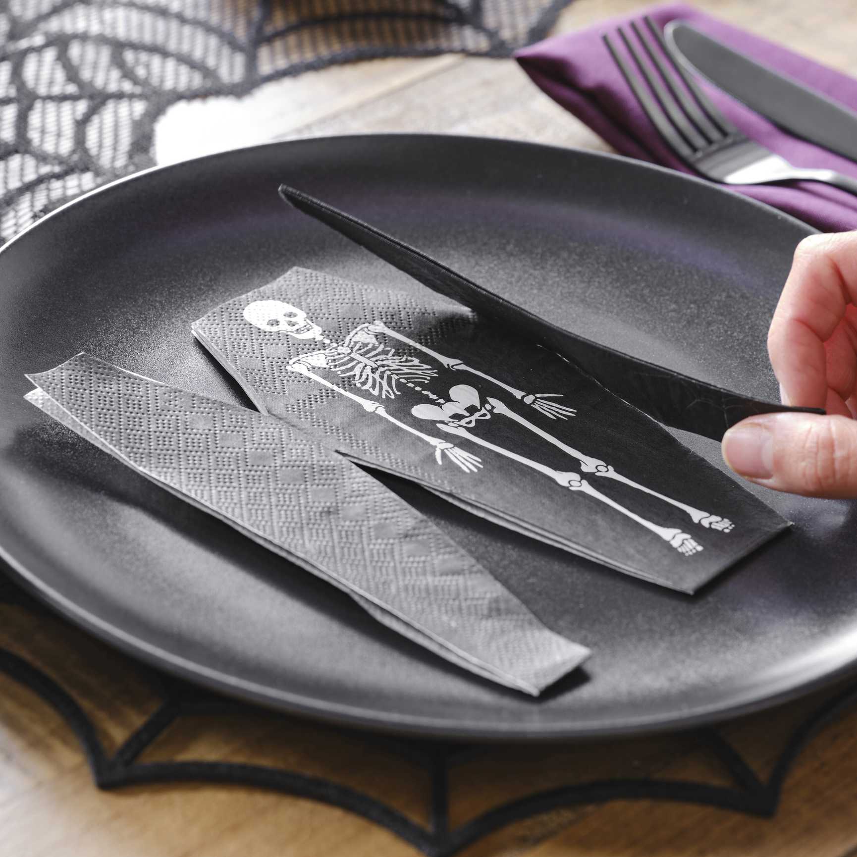 16 x Black and white fold out Halloween napkins, measuring 16.5cm in diameter.