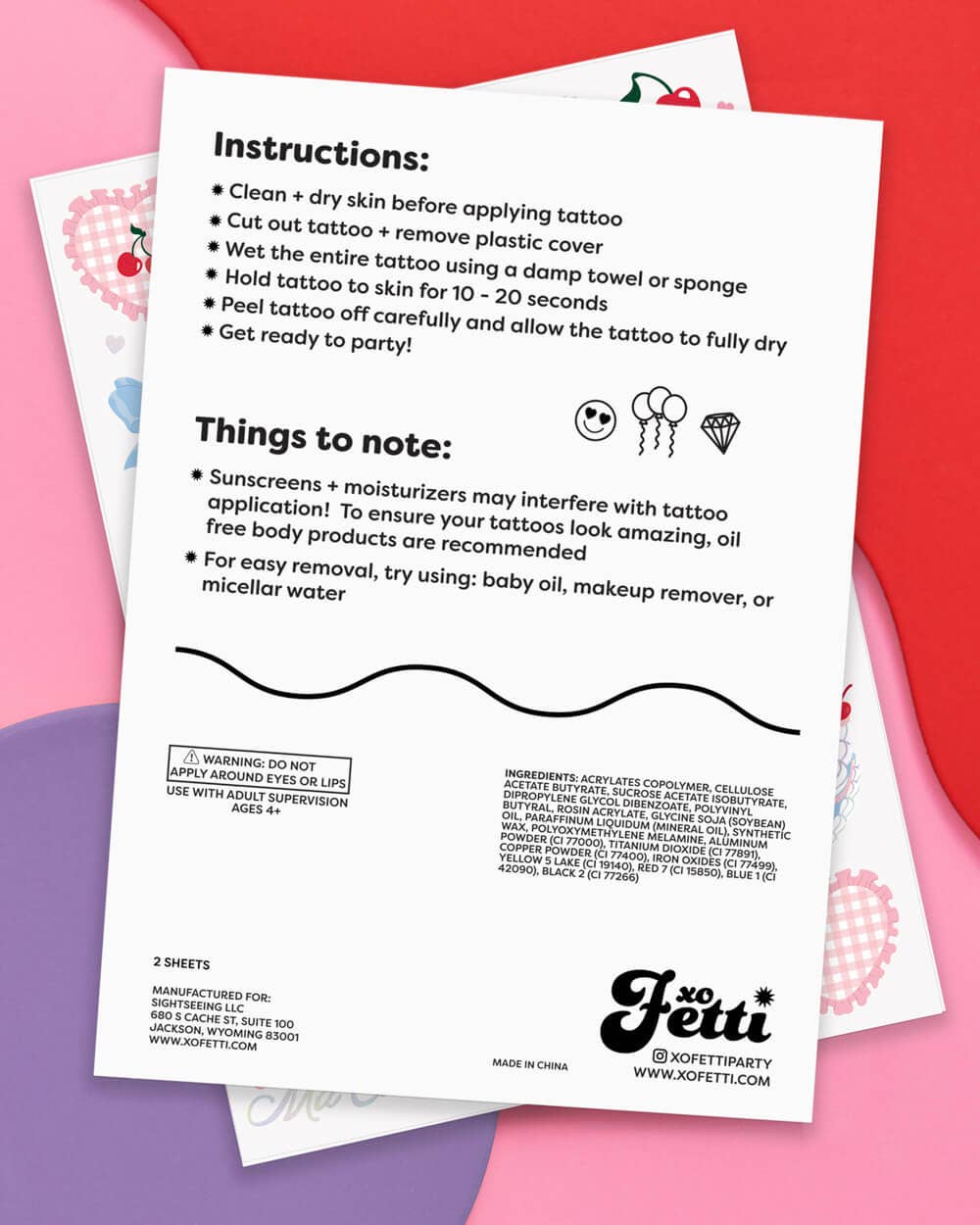 Perfect for anyone who’s all about that extra juicy fun on their big day. 50 temporary tattoos Comes with 2 sheets Full color + silver iridescent foil details