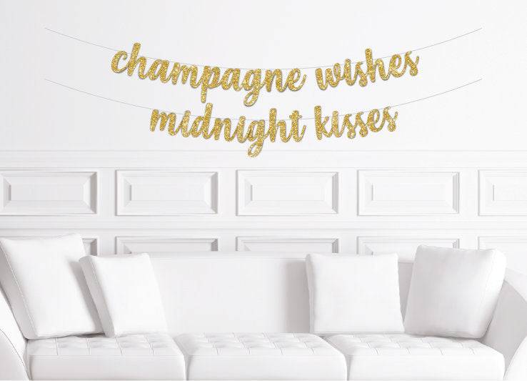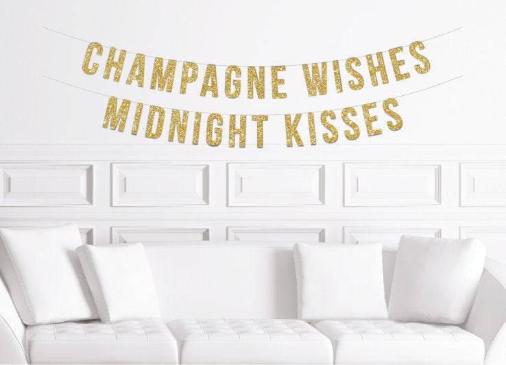 This listing is for one, paper, glitter banner of the popular New Years Eve phrase: Champagne Wishes Midnight Kisses