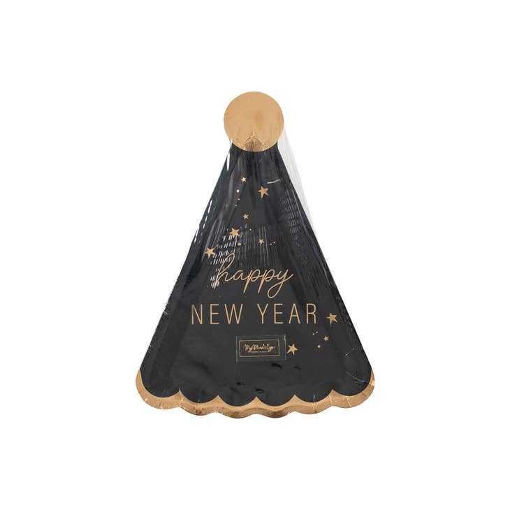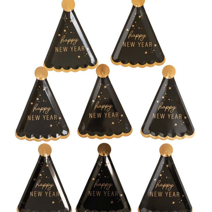 Ring in the new year with this fun hat shaped plate! The gold and black color scheme and Happy New Year script is perfect for a festive celebration, and the fun hat shape is sure to add some personality to your table setting.
