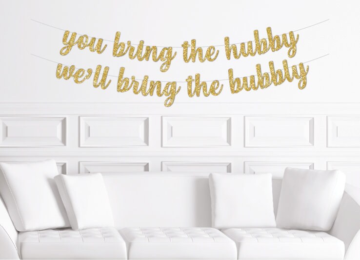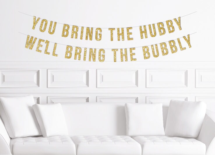 This listing is for one, paper, glitter banner of the popular bridal shower party phrase:YOU BRING THE HUBBY, WE'LL BRING THE BUBBLYSize: 5" tall letters