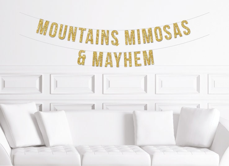 This listing is for one custom personalized paper, glitter banner of the popular Miami destination bachelorette phrase:MOUNTAINS, MIMOSAS & MAYHEMSize: 5" tall lettersMountains, Mimosas and Mayhem Banner Gold, Cabin Bachelorette Decoration
