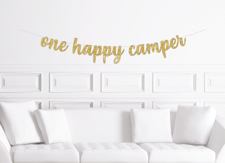 One Happy Camper Cursive Banner / Gold Glitter Script Camping First Birthday Sign / Wilderness Forest Theme Decor / 1st Boy's Woodland Lumberjack