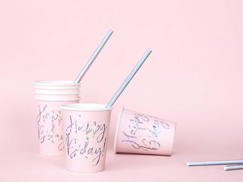 These Happy B'day party cups are the perfect addition to any birthday celebration! In a gorgeous powder pink color and luminous holographic script these cups are sure to delight the guest of honor and all of your party guests! And they are disposable, so cleanup is a breeze!